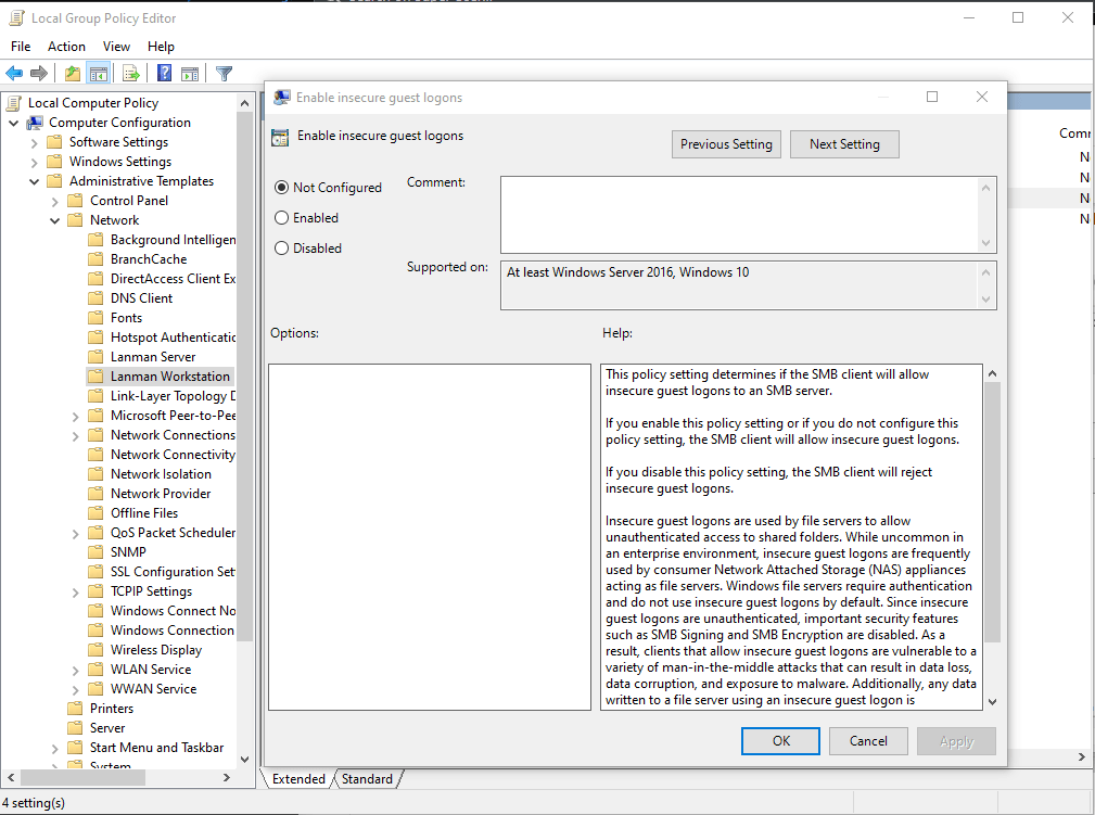 - Open Group Policy, go to Computer Configuration -> Administrative Templates -> Network -> Lanman Workstation, double click “Enable Insecure Guest Logons” and choose “Enabled”, click OK.